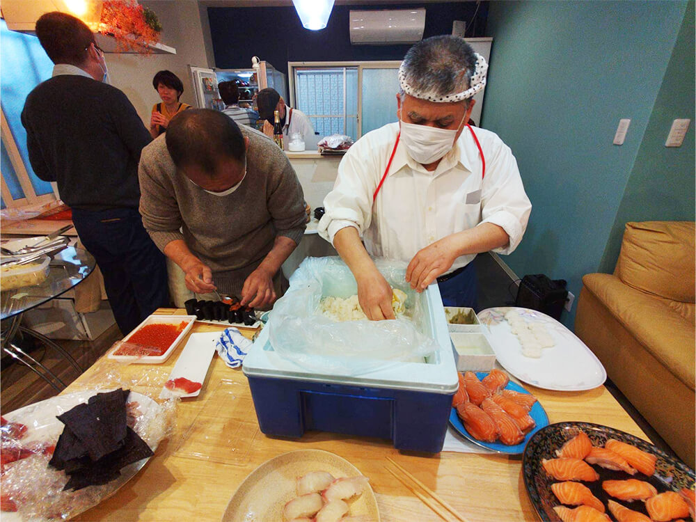 障害者や認知症者らと気軽に交流し、理解を深めるイベントが、大阪市淀川区のNPO法人「ここから100」コミュニティースペースで開かれました。中途失明した元板前の全盲の坂野直也さんがすしの握り技術を披露し、参加者らに振る舞いました。
